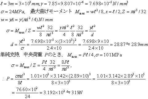 断面形状が円形の長さ 3m の単純支持ばりに、重力による自重で曲げ応力が 24MPa になるようなはりの直径dを求める。ただし、丸鋼の単位面体積あたりの質量は 7.85×10
