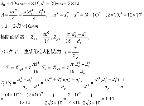外径40mm、内径20mmの中空軸は、等しい断面積を有する中実丸軸の何倍のトルクに耐えられるか求める。