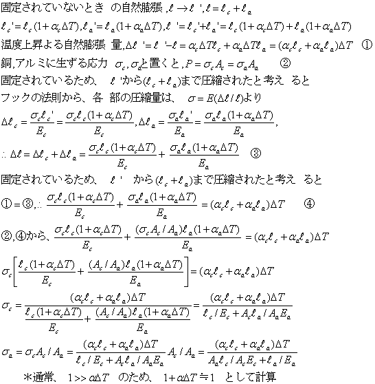 断面積Ac,弾性係数Ec,線膨張係数αcの銅製の棒と断面積Aa,弾性係数Ea,線膨張係数αaのアルミ製の棒が図のように接続され、両端が固定されている。温度がΔT上昇したとき、各部に生ずる応力を計算する。