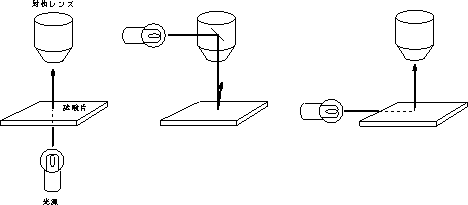 | ● | 変形の様相の観察 光学顕微鏡の観察に際しては,Fig.4に示すように,透過光,反射光及び側面光を用いたが,特に側面光の場合は,変形の形状を立体的把握することができる.側面光はフレッキシブルな光ファイバーを利用したライティング装置により試験片側面から光を当てる。 |