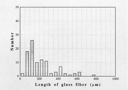SGFはAS材,PC材については直径11μm,PMMA材については10μmのEガラス*で,カップリング剤としてアミノシランが表面塗布されている. 射出成形した試験片に含まれる繊維長さを調べるために,供試材を電気炉に入れ,500℃にて3時間燃焼させ,残ったSGFを光学顕微鏡に取り付けたビデオカメラで撮影し,モニター上でGFの長さを測定し長さの度数分布を求めた.これをFig.2に示す.材料によって幾分相違するが,20〜900μmの範囲にあり,平均は,ほぼ200μm,平均アスペクト比(GF長さ/GF直径)は約18である. |
