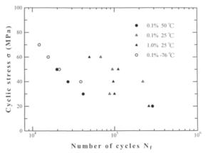 PC材,室温,50℃,-76℃のS−N曲線をFig.5に示す.PC材室温のS−N曲線は,高応力振幅においてはせん断き裂支配型,低応力振幅においては,表面クレイズ支配型になる変形機構の相違から,逆S字形を示し,寿命の逆転現象が生ずるが,50℃のS−N曲線は,逆S字形にはならず,ほぼ一本の曲線となる.室温と比較すると大幅な疲労寿命低下を示している.なお,σa=30MPaにおいては,数回の繰り返しでネッキングが生じ大変形を示し,疲労試験は続行不可能であった. |