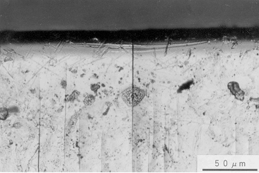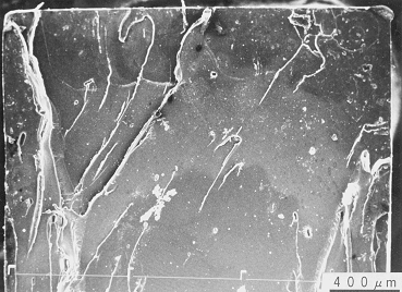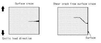 | PC材,50℃においては,低応力振幅の場合,表面クレイズから疲労き裂が成長し最終破断に至る様相を示す.高応力振幅の場合は,表面クレイズの発生,クレイズ端からのせん断帯の発生,せん断帯のき裂化,モードT型き裂の成長となる疲労破壊過程をとる.-76℃の場合は,表面クレイズから疲労き裂が成長し最終破断に至る疲労破壊過程をとる.室温低応力振幅,その他の温度の場合はいずれも表面クレイズから疲労き裂が成長し最終破断に至る様相を示し,このことは,S−N曲線においても同一の曲線にのる傾向を示す要因になっている. |