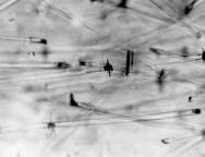 | AS材,60℃の場合のS−N曲線をFig.1に示す.室温の場合と比較するとかなり寿命は減少している.含有率の影響はほとんど認められない.60℃の場合,ごく僅かな数のSGFに,60℃,引張の場合に発生したクレイズと同形態のクレイズが発生する(Fig.2).クレイズの長さを引張の場合と比較すると小さい.発生箇所には60℃,引張の場合ほど長い空隙部は生じない.室温では観察されなかったPC材室温の場合と同様なSGFの剥離が負荷方向と平行,垂直,傾いたSGFに繰り返しとともに成長するのが観察されるが(Fig.2),剥離長さは非常に小さく,疲労き裂には成長しない.また,AS材の室温で見られたSGF端部近傍でのクレイズは発生しない.クレイズの発生は試験片両側の縁に沿う一定幅の狭い領域内に存在するSGFに観察され,低応力振幅ほど領域の幅は小さくなる.すべての応力振幅において,この領域には,負荷方向と垂直な線状の表面クレイズが生ずる.高応力振幅ほどこのクレイズの数は多い.SGFから成長する2次的な疲労き裂は破面には観察されなかった. |