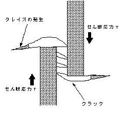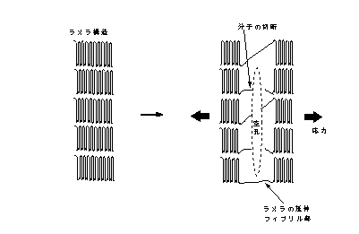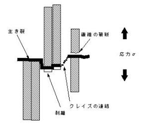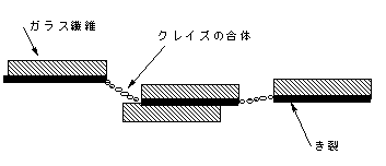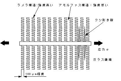 Fig.1.8 き裂伝播の様相,負荷方向と繊維が垂直な配向の場合 |