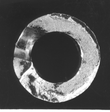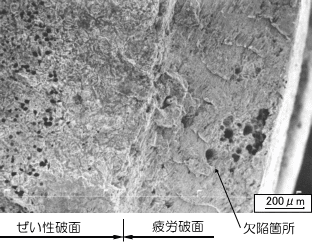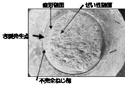 | 底引き網接続金具が破損し、底引き網が流される事故が起こった。接続金具は、釣り具のより戻しのように、ロープのよれを防止するため、回転できるようになっている。金具には引張荷重が作用し、海水中で使用される。このねじ部の谷底の部分からき裂が発生し、破面は、腐食疲労破面の後、ぜい性破面になっていた。表面近くには欠陥箇所が観察され、縞模様は腐食疲労の様相を示していた。 海水中で使用され、腐食疲労により材料の欠陥部からき裂が成長し、その後、衝撃荷重の作用あるいは低温海域での使用でぜい性破壊が生じたものと思われる。 |