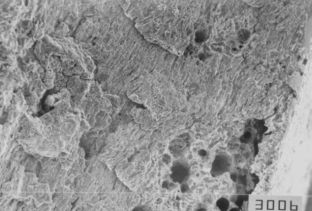 | 大腿骨を骨折したときに、大腿骨の中心部に金具(髄内釘)を入れて大腿骨を固定する。骨髄液の出入りができるように中空で、等間隔にスリットが加工されている(Fig.3)。患者が髄内釘を挿入し、術後、生活しているうちに、髄内釘が破損した。破面観察の結果、歩行時の負荷により繰り返しの曲げ変形が加わり、スリット部の応力集中箇所から疲労き裂が発生し破断に至ったと推定された。この場合は、スリットのき裂発生部近傍が、アンダーカット気味で、応力集中が設計よりも大きくなっていたと思われる。Fig..6は破面で観察された疲労特有の縞模様、ストライエーションである。 |