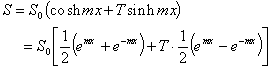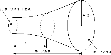 | よく知られているエクスポーネンシャルホーンの場合、音の入り口から出口までの断面積が指数関数的に変化することを意味します。図1で、ホーン入り口、ホーンスロートの断面積Soとすると入り口からxの位置での断面積Sは次のような式になります。 |