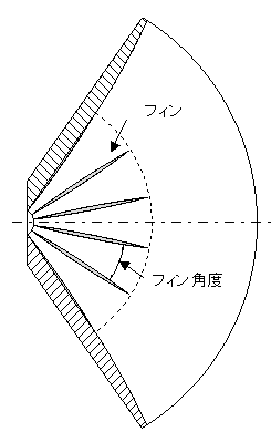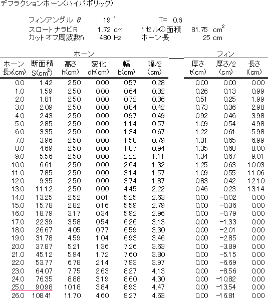| ホーンの寸法は、距離x とともに変化する面積Sを確保することにあります。フィンの形状、フィンの先のホーンの形状、寸法が計算で求まります。パソコンでプログラミングして決めれば簡単に計算できます。Excelのマクロ処理の結果の一例を示しました。フィンで音道を仕切るデフラクションホーンの場合、図のようになります。 |