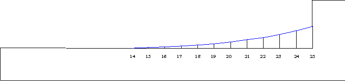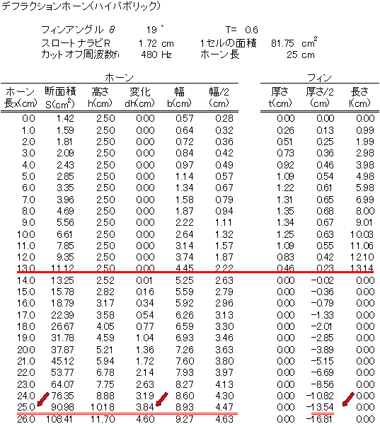 | 1セルの出口のホーン面積81.75cm2 はホーン長x=25cmで達成されるので、フイン開始点から250mmのホーン長になる。このとき、dh= 3.84 cm となり、ホーン部の厚さは50mmで良い。 |