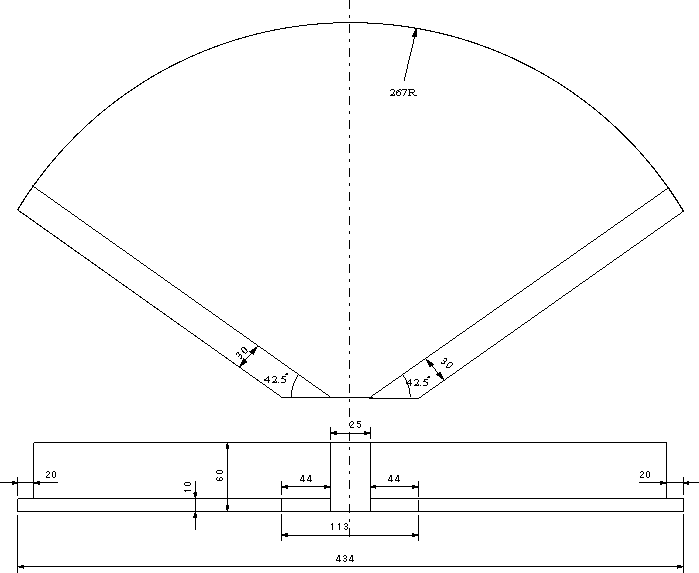 | ● | 側板の板厚t = 30 mmの時 t/sin42.5゚= 44.4 mm tsin42.5゚= 20.3 mm、ホーン幅 = (12.5 + 184.3 + 20.3 ) ×2 = 434.2 mm ホーン半幅 217.1mm |