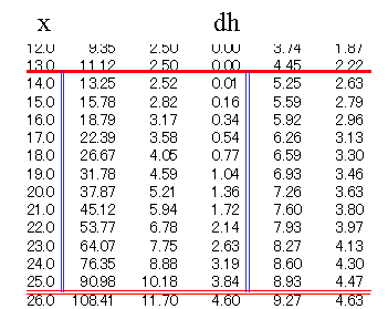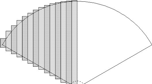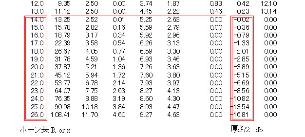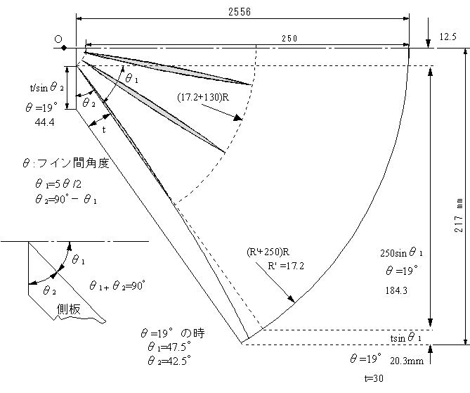 | ■ | ホーン本体部、側板の詳細寸法の計算 フィン角度θ、ホーンセル数nとすると θ1= nθ/2、θ2 = 90゚−θ1 、 表1から ホーン長x=25cmで フィン厚さ/2 = 13.54mm であるので θ=19゚, θ1 =47.5゚, θ2 =42.5゜ |