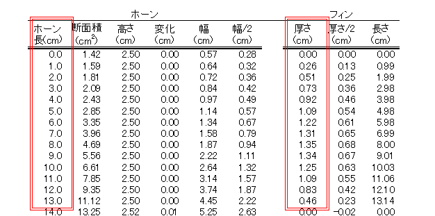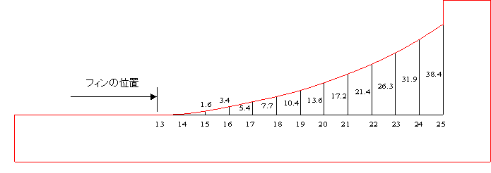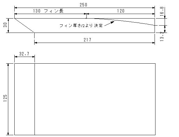 ![]() (a) フィンの形状の型紙 ![]() (b)両側面に型紙を写して削り出し 表8の場合板厚13.5mm 図10 フィンの形状 |
