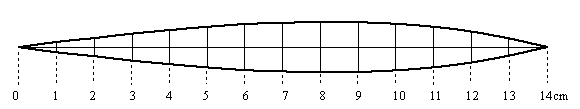 | 曲面削りだし用の型紙は、10mm間隔の目盛り付きの厚紙、A3版の「学校教育工作用紙」をDIY店で購入して図8のような型紙を描いて、切り抜く。強度不足で変形する場合は2枚貼り合わせて使う。曲線部は、雲形定規か自在定規で結び、切り口がなめらかでない時は、サンドペーパーで磨いて滑らかにする。 |