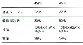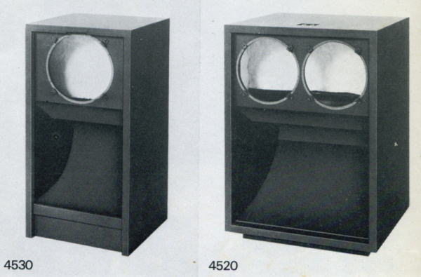 | 〈4530 リア・ローディング・ホーン〉 \78,900 4530は38cm口径スピーカー1個用のエンクロージャー。量感ある低域再生のために全長2mの折返しホーンを持ったリア・ローディング型で、50Hzまで再生可能、60Hzまでフラットな特性です。また150Hz以上はウーファーがダイレクトに再生します。 く4520 リア・ローディング・ホーン〉\166,500 4520は38cm口径スピーカー2個用のエンクロージャー。全長4mの折返しホーンを持ったリア・ローディング型で、42Hzまで再生し、50Hzから上をほぼフラットに再生する、すばらしい特性です。 山水電気 「JBL Professional Series、'76.3.1」カタログより |
