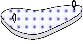 ベニヤ板を用意する。4mm厚程度のシナ合板が良い。ベニヤ板の上に銅板を置き,図のように4mm程度のボルトで,外縁に沿って、ボルトの細い部分を銅板に当て金槌でたたいてゆく。たたいた箇所は変形し、曲面ができる。外周部が終了したら内部も同様に曲がり具合を見ながらたたいてゆく。たたいた箇所が、銅製の鍋などのようなきれいな模様になるのでデザインも考えてたたく箇所を決める。硬い板の上で作業すると銅板が変形しにくいので,比較的柔らかいベニヤ板を使い,一度使った箇所は使わない。私は4mm厚のシナ合板を使っている。コンクリート台の上にベニヤ板を載せると銅板は変形しやすい。