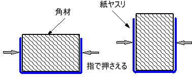 硬いものを紙ヤスリで研磨するとき、木製の角材を準備し、紙ヤスリを図のように巻き付け、指で押さえるか、ホチッキスで固定するかして研磨する。研磨面積に応じて縦、横を変える。いろいろな寸法の長さ30mm程度の角材を用意しておくと便利。