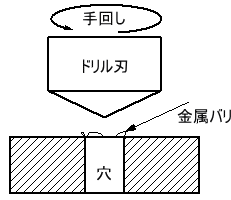 金属に穴を開けたとき、必ずバリが出る。このバリを取らないと危険ですので取ることになりますが、銅などの比較的柔らかい金属の場合は、穴の径より大きいドリルの刃で手で回して回転させるととれる。硬い金属の場合は電気ドリルに刃を固定して低速で余り力を加えないで回転させる。専用のバリ取り工具も販売されています。 |