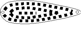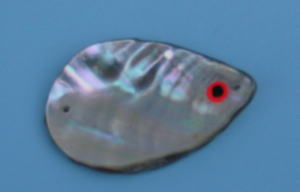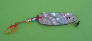 *今まで、10g, 15g, 18g, 21g, 30g等のアワビのスプーンを製作しました。これ以上重いスプーンは2mm厚の鉛板で製作しています。また、なつめ形錘を変形させてシンカータイプのものも作っています。また、アワビの代わりに真珠貝を使ったものも作っています。アワビよりも凹凸が少なく簡単です。他の貝でも製作可能と思います。
