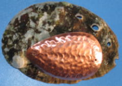 mm程度の銅板をDIY店で購入し、油性のサインペンで型紙の輪郭を写す。線に沿って金切りバサミで切り出す。この時、ハサミは移動させないで、銅板を回転させるときれいに切れます。ハサミを小刻みに開閉させると切断面が荒れますので、刃の長さ一杯に使います。銅板は貝殻の強度を補うために使います。
