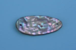 内面表面の写真です。貝が成長過程にある領域の写真。ピラミッド構造と言います。 板状の結晶が積み重なった状態です。この構造と板状結晶が反射して独特の輝きがします。表面は汚れを取るくらいでサンドペーパーで研磨しない方が無難です。良くアワビの薄片を張ったスプーンを見かけますが、この構造の材料を薄片に加工できるのかどうか疑問です。何か特別の技術があると思います。