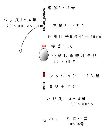 | ヨリモドシの中間に、亀型中通しオモリ、下側にはショックを和らげるための蛍光ゴム管、上側には、赤いビーズ、魚の目を引くためのもの。魚がエサをくわえたとき、糸がオモリに関係なく引かれ、穂先に当たりとなって伝わってくる。昆布や岩に引っかかり(根がかり)にくいのが特徴。特にアイナメはキラキラする光り物に興味を持つと言われているので色々な蛍光玉、反射板等を付けても良い。上部三環サルカンと下部ヨリモドシまでの仕掛け糸は,5号,40〜50cm程度にとっている。図で,道糸にスナップ付きヨリモドシを付けて,仕掛けと連結している。道糸は夜釣りも考えて太めのサイズを使用している。40センチオーバーのソイ、6.5キロのタコがかかった経験から。 | ||||||||||