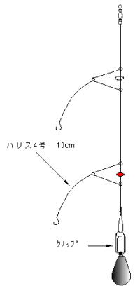 | 中間に三角ピン、片テンビンを付け、一番下にナス型のオモリを付ける。オモリは根かがかりしやすいので、仕掛け紛失の被害を最小限にするため、仕掛け糸より細い捨て糸で、仕掛けとオモリを連結する。こうすると、オモリが根がかりしたときにこの糸が切れオモリだけの被害で済む。また、捨て糸の代わりに、書類を挟むクリップを使っても良い。強く引くとクリップの針金が伸びてオモリがはずれ仕掛けは助かる。慣れてきたら三角ピン、片テンビンをハリス以上の間隔にして、ハリを二本付けても良い。このタイプは、当たりが敏感にダイレクトに穂先に伝わる。 | ||||||||||