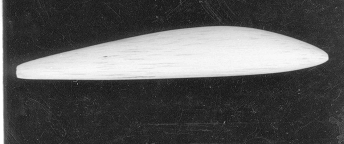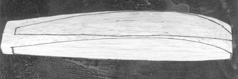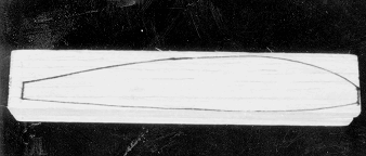 側面の型紙を面積の広いバルサー材の面に置き,鉛筆で輪郭をバルサー板に書き込む。反対側の面も同様(図3)。カッターナイフでこの輪郭線に沿って削ってゆく。出来上がったら(図4),削った面に、上から見た平面図の型紙を置き,輪郭を反対側の面にも写す。この線に沿って丁寧に削ってゆく(図5)。
