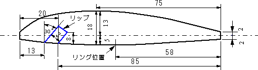 リップは図に示す寸法程度に3mm厚のアクリル板をアクリルカッターで加工し、加工後,サンドペーパーでなめらかに仕上げる。リップのための,差込口を糸鋸で切り込む。大きさ,角度,深さなどはモデルのまねをした方がよい。 |