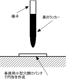 図のように、楊子に付けるラッカーの量は試行錯誤して決めるしかありません。少しずつ、何回か円形の中心に楊子の先端を付けてもラッカーは乗ります。