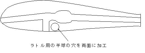 ラトルを設ける場合は、図の位置に半球の穴を両面に加工。内面を油性ラッカーで2度 塗り。2B,3B程度のがん玉オモリが入ってルアーを振ればカタカタ音がでるのを確認する。鉛の大きさが大きいほど低音となる。