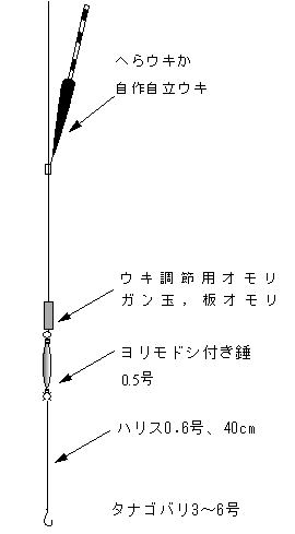 ハリスは潮の流れに乗せ、餌が自然と流れるように、 普通より長めにとっている。ハリを錘の上に1本追加しても良い。竿は、磯用ヘラ竿4.8m,