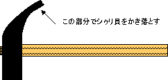 金槌の釘抜き部分でシュウリ貝をかき落とす |