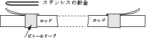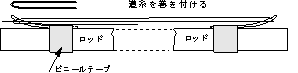 ステンレスの針金を図のように曲げ、ビニールテープを竿に一巻きし、その上にステンレス針金を置きテープで固定。 |