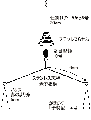 | 図に示す仕掛けを作った。らせんと天秤はステンレス線で作った。らせんは、吸い込み用では小さいので、図に示す大きさのものを自作した。天秤は市販のものでも良いが、赤で塗装した。ステンレスの半田付けは専用の半田とフラックスが必要でちょっと面倒です。夏目型の錘の号数は団子の大きさとロッドの負荷に合わせて決めます。また、ポイントまでの距離によって団子の大きさなど決めます。天秤を付けるのが面倒な場合はダブルの針にして重りの下に直結しても良いと思います。 |