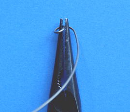 ![]() 絡み防止のため、ピンクのゴム管に穴をあけハリスを通している。 太目の縫い針を使うと簡単に通せる。 |