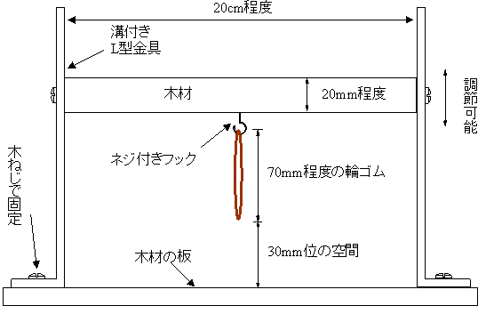 ![]() L型金具、DIY店で購入可能、溝付きのため輪ゴムの高さ調整可能 木材も端材として売られているものがあります。 |