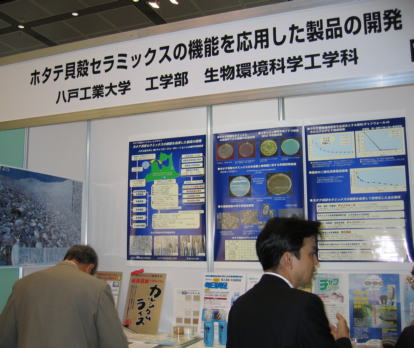 | イノベーション・ジャパン2005は大学の研究成果を発表する展示会です。 小山研究室では,イノベーション・ジャパン2005に大学ゾーン環境・エネルギー分野に出展しました。今年の出展では990部の資料が配布されました。大盛況でした。ビジネスに発展したものもあり,問い合わせしたいという企業も10数社ありました。 「イノベーション・ジャパン2005-大学見本市」新技術説明会は30分のプレゼンテーションで,「ホタテ貝殻セラミックスの機能を応用した製品開発」と題して,9月29日(木),11:00-11:30 ガラス棟,G502で発表しました。講演番号PE-01 |