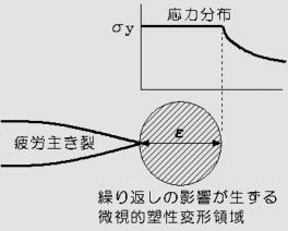 | 以上は、低サイクル疲労試験の巨視的関係を示したが、高サイクル疲労における疲労き裂先端の局所的領域では、応力集中のため降伏応力以上になる結果、塑性変形、ひずみ硬化、空孔の発生、連結、主き裂の成長の過程を経て、不連続的なき裂の成長を示す。この塑性領域において、低サイクル疲労と同様な現象が生じていることが分かっており、高サイクル疲労における疲労き裂伝播の理論において、き裂先端の局所的領域での組織変化の様相として低サイクル疲労で得られた情報が適用されている。 |