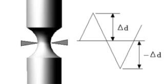 試験片は座屈を防ぐため砂時計型、最小直径部の引張圧縮変位 ±Δd、結果的には、引張圧縮塑性ひずみ ±Δεpを制御していることになる。 |