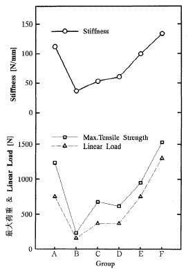 一方、Group-Cの翻転した場合は,Group-Bと同様、BPの腱繊維付着部より移行部で断裂により破断するが、繊維付着部に作用する力は、生理学的な方向であり,Group-Bの場合より強度が得らたものと思われる.