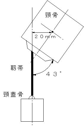 | 実際に、靱帯,膝頸骨,頸蓋骨の位置関係は図式的に表すと、図のようになる。頸骨の中心と頸蓋骨の中心が水平方向に20mm程度異なること、頸骨の軸と靱帯の軸が43度の角度を有している。本来は鉛直方向においては同一平面内にないが、今回の実験においては、靱帯,膝頸骨,頸蓋骨のそれぞれの軸は同一平面内にあるとして実験を行った。そこで、次の事項を考慮して設計を行った。 | ||||||||||