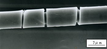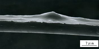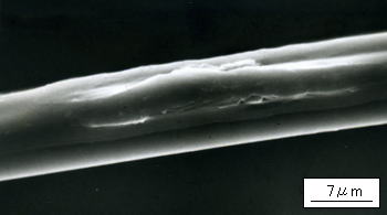 | 1.はじめに 食品工場で酸性食品が通るGFRP複合材料のパイプやタンクの破損事故が報告されて、酸環境での複合材料の挙動が問題になっている。 ここでは、酸環境中で一定負荷を受けるガラス繊維の腐食の様相をSEM観察した。 |