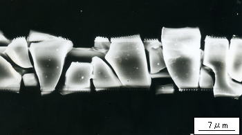 | 無負荷の状態の腐食状態のSEM写真を図2に示す。腐食の様相は前報の結果と同様である。ノズルから出たガラス繊維、フィラメント(3〜24μm)は、図3のように収束器をを通して、用途に応じて40〜4000本のフィラメントをまとめてストランドにし、これを束ねてケーキにし、製品となる。この紡糸過程でガラス繊維にはねじりが作用し、これが残留応力となり、螺旋状のき裂が生ずると推定している。 |