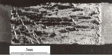 前述のようにルーペで観察できる程度の大きさの疲労き裂は寿命のかなり早い時期に腐食孔底より発生する。き裂発生直後の写真をFig.11に示した。また,数個の腐食孔がある場合は,各々の孔食底よりき裂が発生し連結して最終破断にいたっている(Fig.12)。Fig.13は,未使用材の場合のき裂発生直後の写真であるが,繰り返しとともに多くの extrusion,intrusion が出現し,成長し,その後,数多くの微視き裂が発生する。寿命の大部分はこの過程に費やされ,試験片の縁より発生したものが主き裂となって進展し最終破断に至っている。Fig.14は,腐食材の巨視的疲労破面であるが,かなり凹凸が激しく,その方向はラミネーションの方向と一致する傾向が認められる。一方,未使用材の破面は比較的平滑であり(Fig.15),腐食材,未使用材ともき裂伝播の最終段階に近い領域に,き裂伝播の方向と対応すると思われる縞模様が観察された。