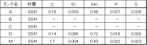 実験に用いた材料は,石油タンク解放点検時に切り取った公称板厚 6 mmの内面,外面腐食のいずれか一方を受けた石油タンク底板と同一板厚の未使用材で,いずれも SS-41材である。腐食材を採取したタンクの仕様をTable 1に示す。また,これらの化学成分を Table 2 に,機械的性質をTable 3に示した。Mは未使用材のSS-41である。