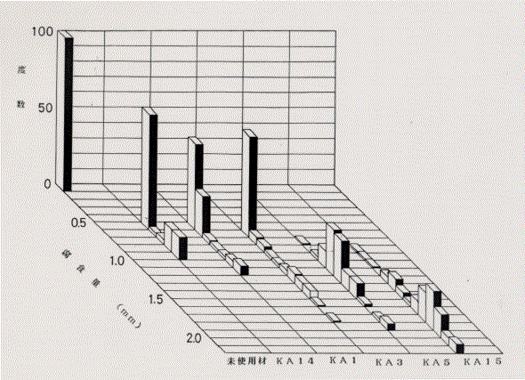 Fig.6 は未使用材も含めて,外観上腐食程度が異なる試験片について典型的な度数分布の形状を比較したものである。腐食量の平均値が原点から離れる程,山の高さは低下し,分布は広く分散してゆくことがわかる。