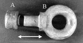 Fig.2は破断部品の写真である。A部はネジによってB部に固定され更にA部はB部の端で溶接によって固定されている。荷重は矢印の方向に引張荷重が作用したと思われる。写真から破壊はB部の不完全ネジ部から生じていることがわかる。
