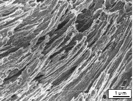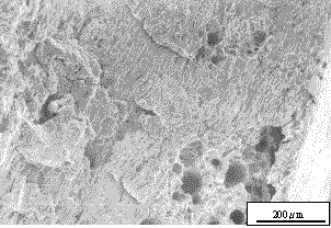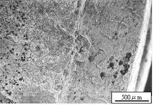 また,破断部分は赤錆がひどかったので3%塩酸アルコール溶液によって酸洗した。実体顕微鏡による観察の結果,ぜい性破面部Tの中央領域に比較的黒い層が同心円状に存在していた。Fig.4の電子顕微鏡写真に示すように、これは,析出物の層,あるいは空孔が密集した層であった。また,これらの領域の反対側のネジ底には疲労破面が観察された。破面のすぐ隣とそのまた隣のネジ底の組織を光学顕微鏡で観察した結果、ネジ底と山部にはかなり多くの孔食が存在していた。また,他の隣接するネジ底にはかなり深いき裂も存在していた。