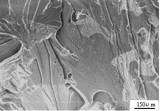 Fig.4はき裂発生近傍の破面写真である。この写真においてもかなりの析出物と欠陥部が認められる。欠陥ぶはディンプルに似た形状から,これは析出物が変形のために抜けた痕跡と思われる。また,観察の結果、き裂は必ずしも不完全ネジ底から発生していないこがわかった。腐食孔,欠陥部の存在がかなりき裂発生に影響していると思われる。Fig.5の破面にはストライエーションが観察され,疲労によってき裂が進展したことがわかる。この面は腐食の影響を受けているが,酸洗いによっても腐食を受るので破壊時のものか破壊後のものかはっきり断言できない。また、欠陥部がかなり表面近くに存在していることがわかる。